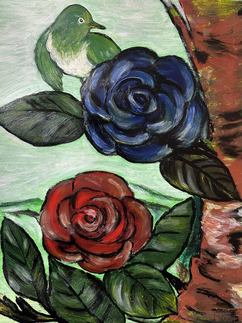花と小鳥で、自然を感じるような絵をかいてみました。