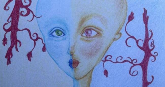 自分の中にある二面性を月と太陽の宇宙人として表現しました。