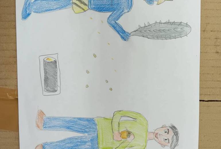 運動会のリレーをしている人達を描きました。皆が1位をしている場面を描きました