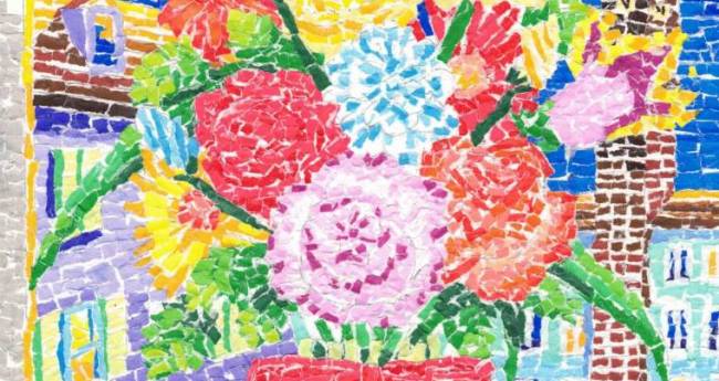 現代に現れたシンデレラが、王子様に拾って貰ったガラスの靴を窓ぎわに飾り、貰った花束を活けています。そしてそろそろ寝ようとしている時間です。深夜0時前になり、王子様と出会った時を思い出している。そんなストーリーをちぎり絵にしました。
