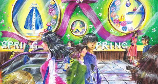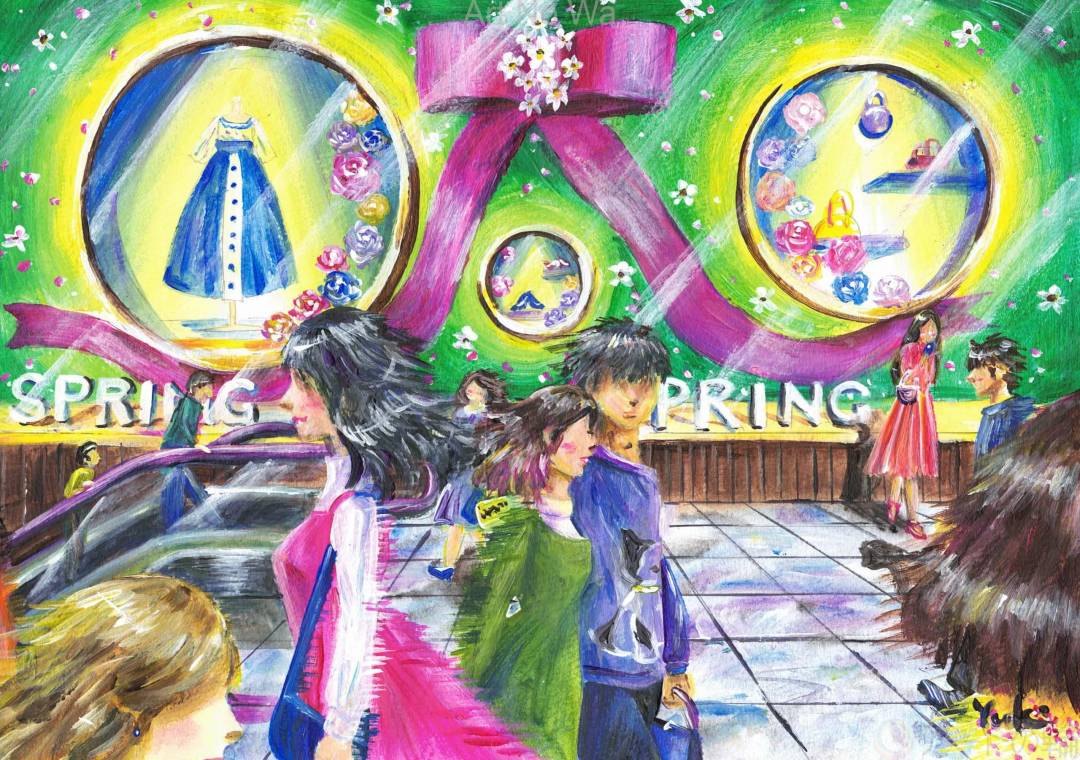 ファッションビルで待ち合わせをしています。エスカレーターから上ってくる人、通り過ぎる人…。色んな日常を描きました。