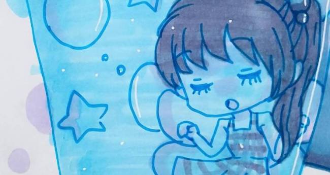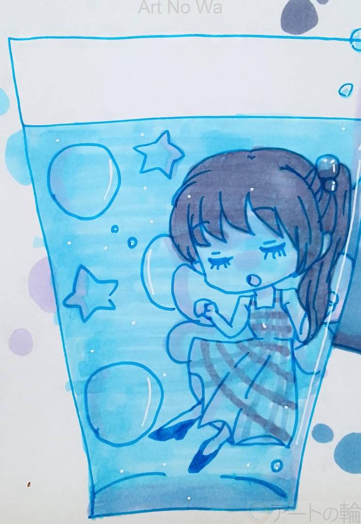シュワシュワと鳴るサイダーの中に潜っている妖精の女の子を描いてみました。