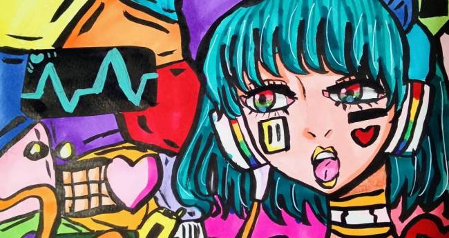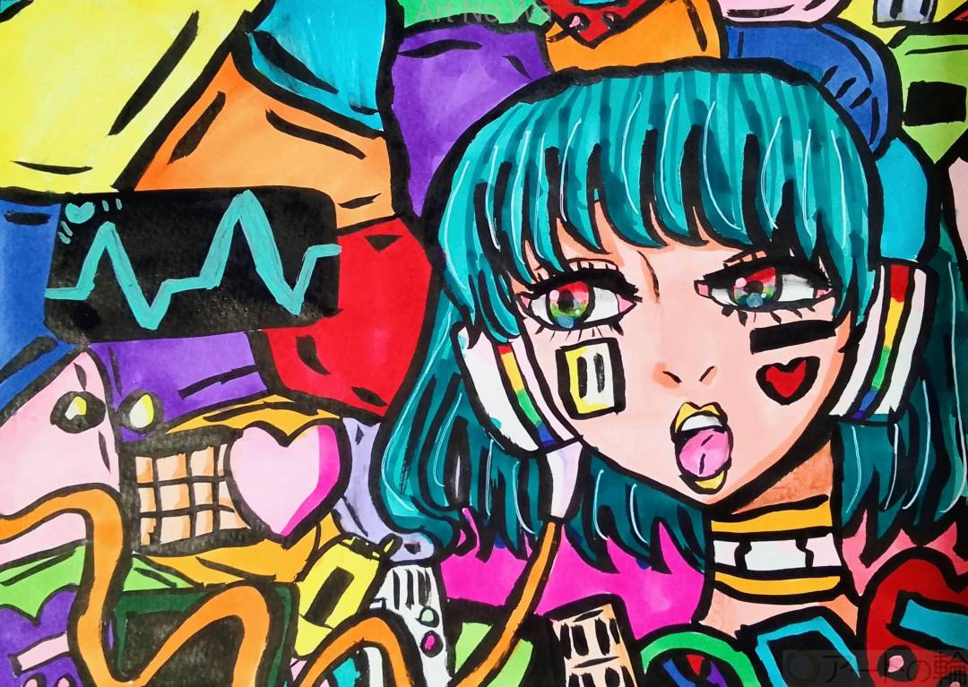 機械の女の子が何かにときめいている様子を未来的なポップな感じに描いてみました。墨汁とイラストマーカーとその他の組み合わせで描いてみました。ハイライトにホワイトも付けました。