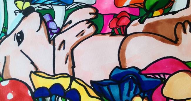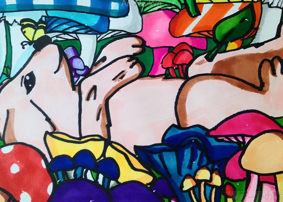 キノコが沢山ある森で寝ころびながらモンキチョウと遊んでいる犬を描いてみました。