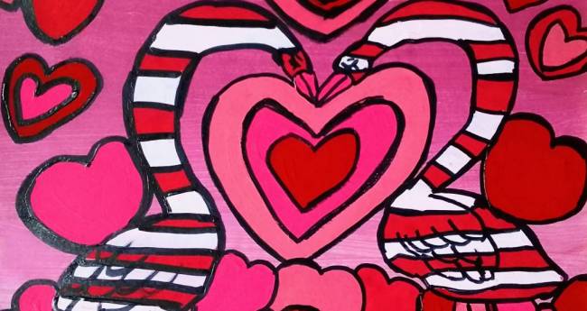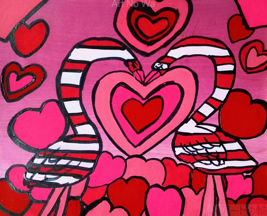 2匹のフラミンゴがハートを作りながらキスをしている様子を描いてみました。