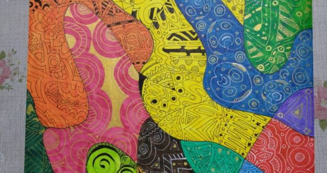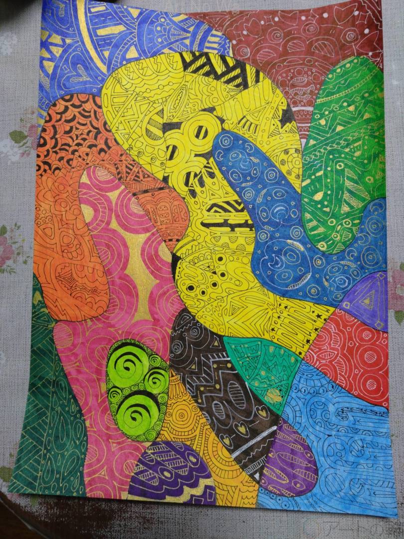 自分が描く模様は毎回進化しているように思う。その時の気分、疲れ具合、やる気の度合い、体調にもよるが、基本集中力がある時に描いている。時にゼンタングルを描くこともあるが、集中力がみなぎってる時は今までと全く違った模様が出てくることもある。最近は手描き栞を描いていて、色ペンでオリジナルの模様の栞を人にあげたり販売したりもしている。苦手な画材でできる表現と自分の絵が合わさることで表現が日々進化しているように感じる。今後も自分のペースで絵の活躍する場を広げていきたい。
