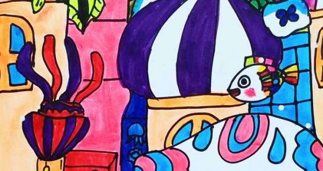 油性マジックペンと水性マジックペンと白いペイントマーカーでで海の中に街ができている様子を描いてみました。魚やクラゲ達も楽しんでいます。
