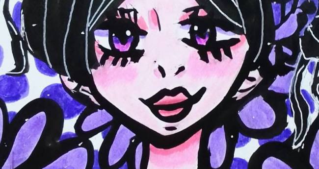 水彩毛筆ペンと墨汁とその他の画材で紫の花の着物を着ている大和撫子な女性を描いてみました。