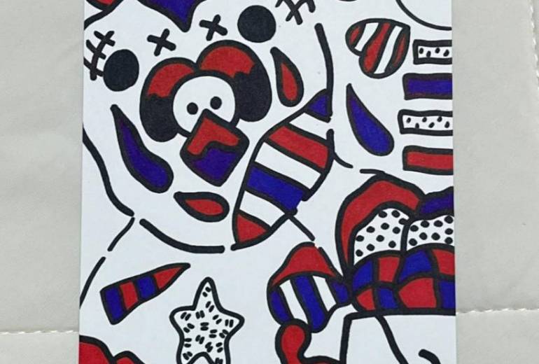 3種類のうさぎ・ピエロみたいな双子・ロボット顔の太陽・4人のおばけが集まっている、入園式の絵を描きました。入園式と言う明るさを出したくて、全体的に色々な色を使ってバランスよく模様も組み合わせました。