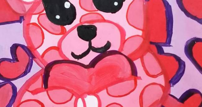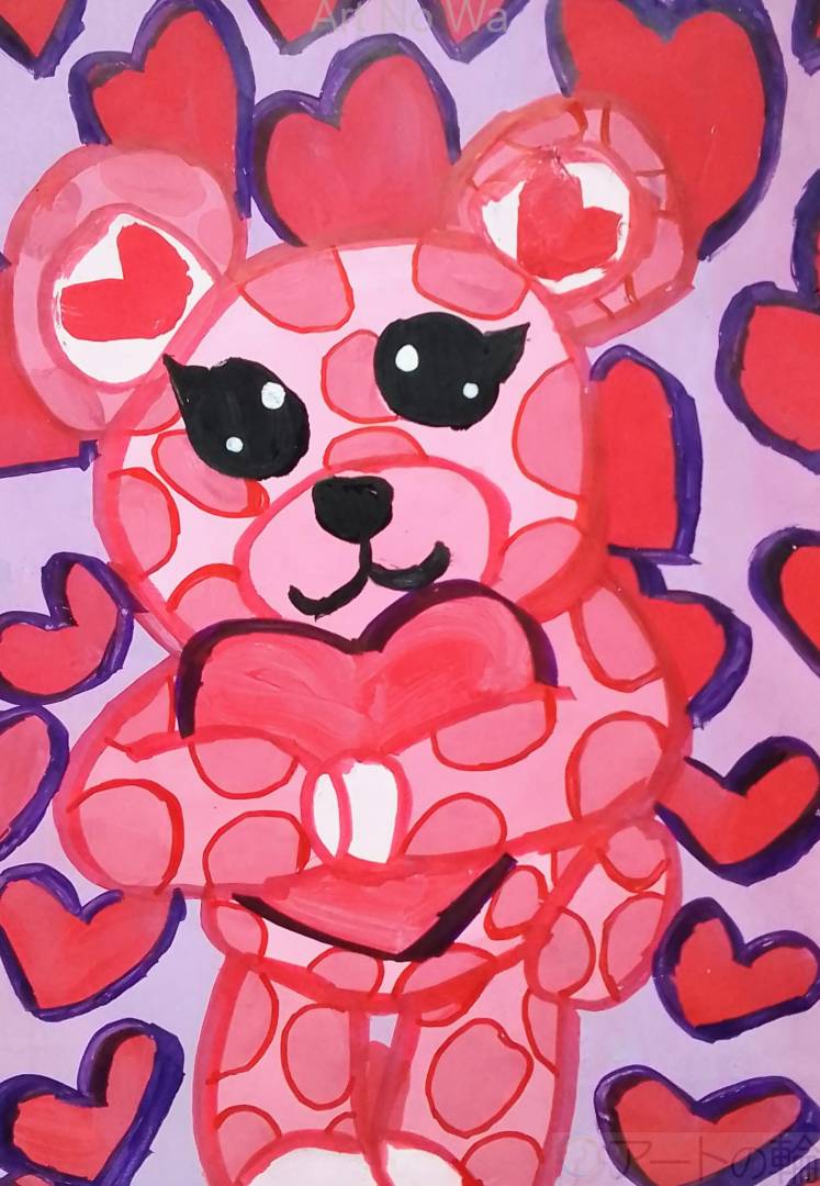 赤いハートを抱きしめているハート柄の熊を描いてみました。