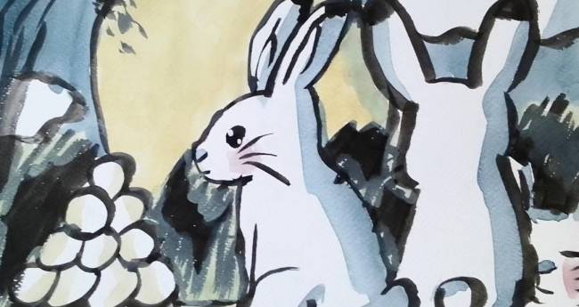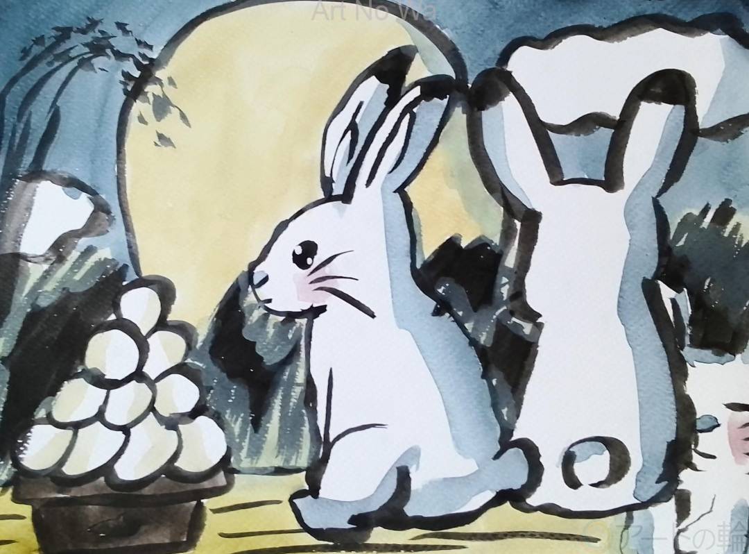 兎達が十五夜の満月を民家から仲間と一緒に眺めている様子を描いてみました。