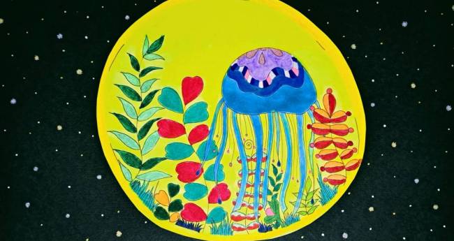 非現実,屋外,自然,海,空,現在,未来,黄色,緑,水色,青,黒,植物,星,明るい