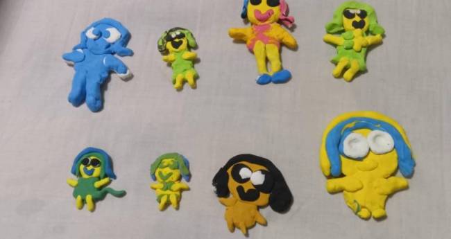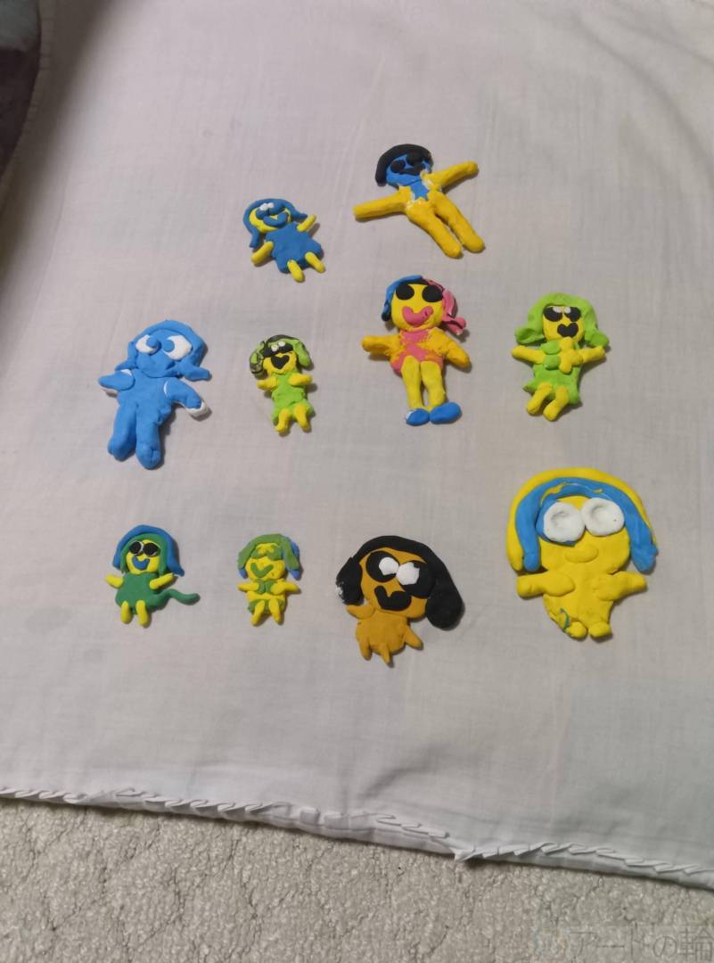 白い紙粘土にえのぐで色をつけて、沢山お人形を作りました。カラフルでかわいい!