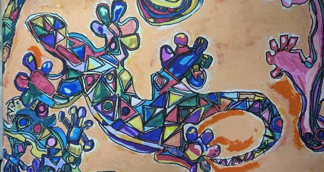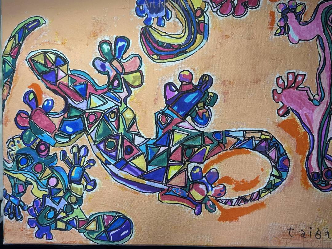 僕の家族を蜥蜴をイメージして描きました。パパとママとお嫁に行った姉さんです。いつも仲良しで、大好きなファミリーです。