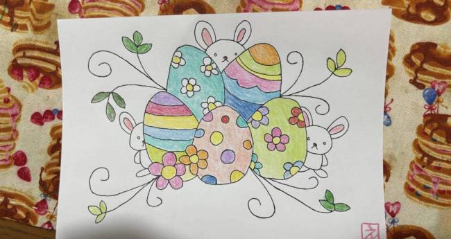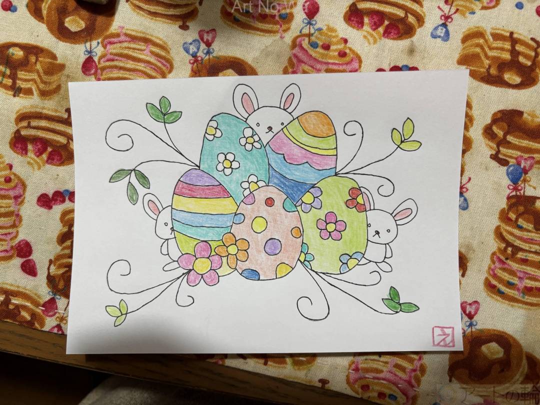 様々な柄のイースターエッグと隠れたうさぎさん達を描きました。