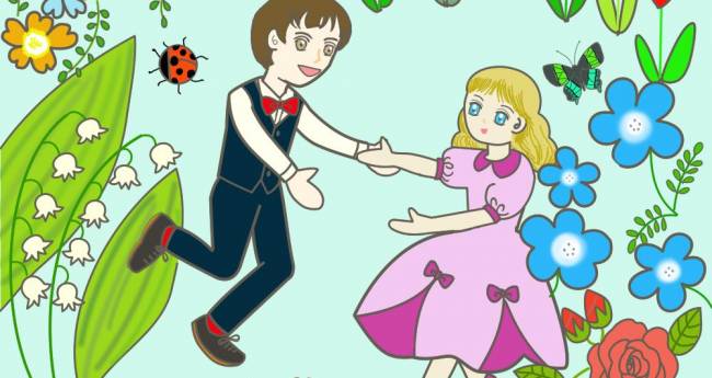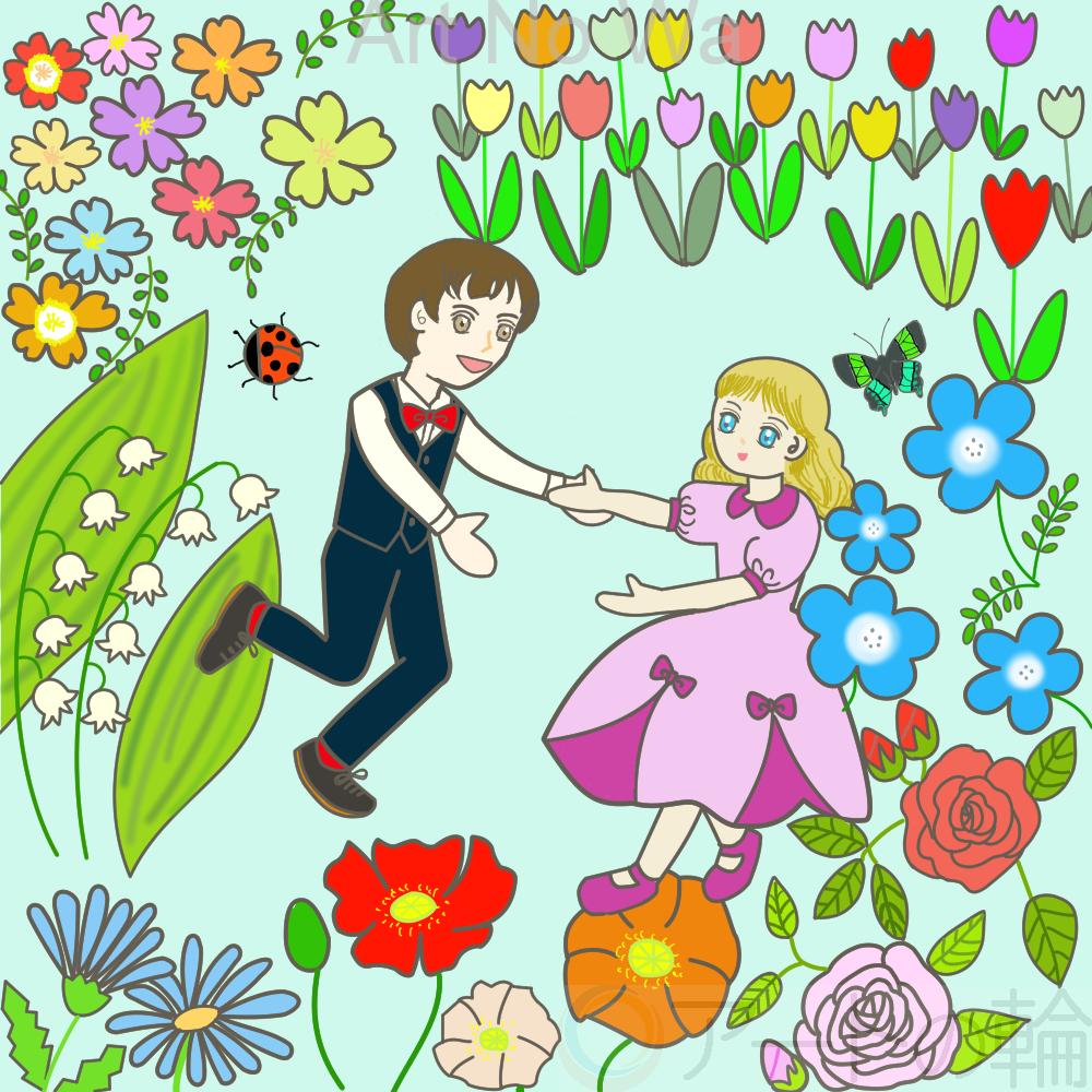 沢山の花に囲まれて、春の妖精たちが踊っています。楽しい音楽に誘われた ちょうちょとてんとう虫がやって来ました。 絵を描くことは好きになって来たのですが、人を描くのに とても時間が掛かってしまいます(苦笑)。