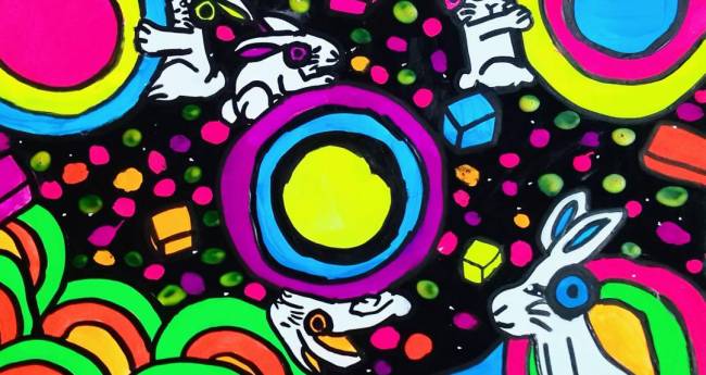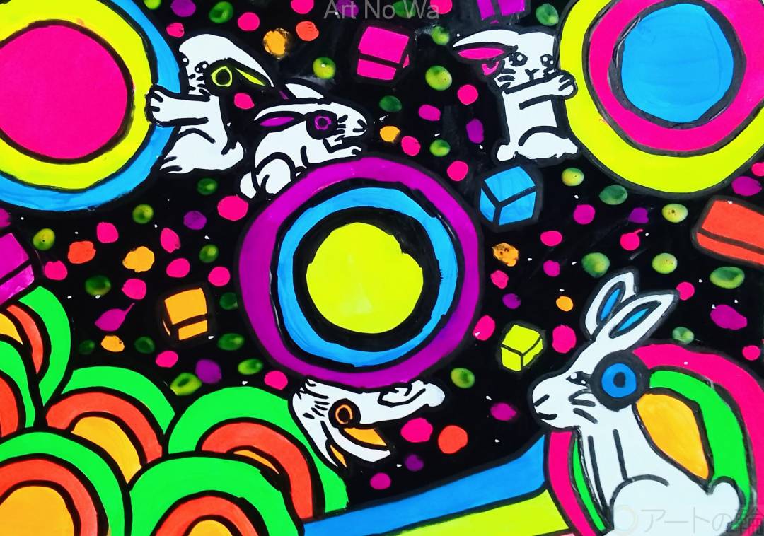 エレクトリックでネオンなミュージック的な世界で兎達が楽しんでいる様子を描いてみました。