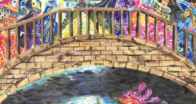 ヴェネツィアのカーニバルが行われ、橋の下を通過しようとしているゴンドラの赤い衣装の人が、アコーディオンを奏でて、橋の上の緑のドレスの女性がそれを聴き、立ち止まる。2人の目線が合い、そこから物語が始まる。お祭りの華やかな雰囲気の中、2人の時が止まる。そんなストーリーを込めました。