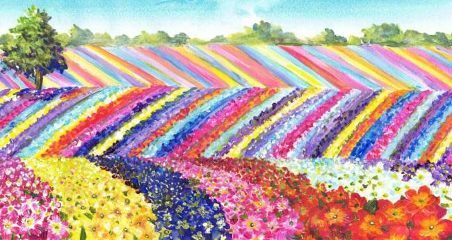 プリムラが咲き誇る広大なお花畑です。晴れ渡った空と、一面のお花畑から漂う花の香りも楽しみに来ています。どこまでも広がる美しい世界。色鮮やかなそんな世界に癒され、力を得、次の日からまた頑張る活力を得る。そんな想いを込めました。