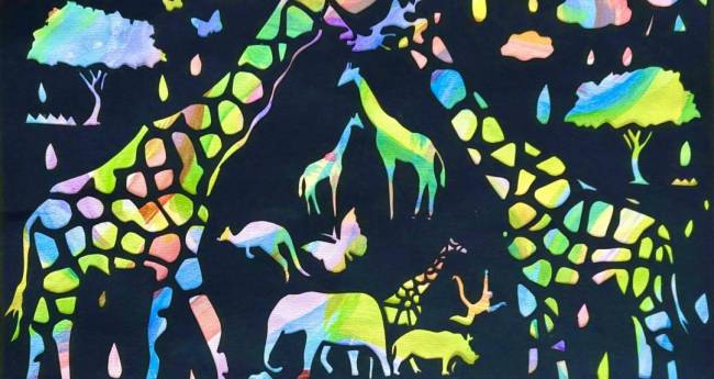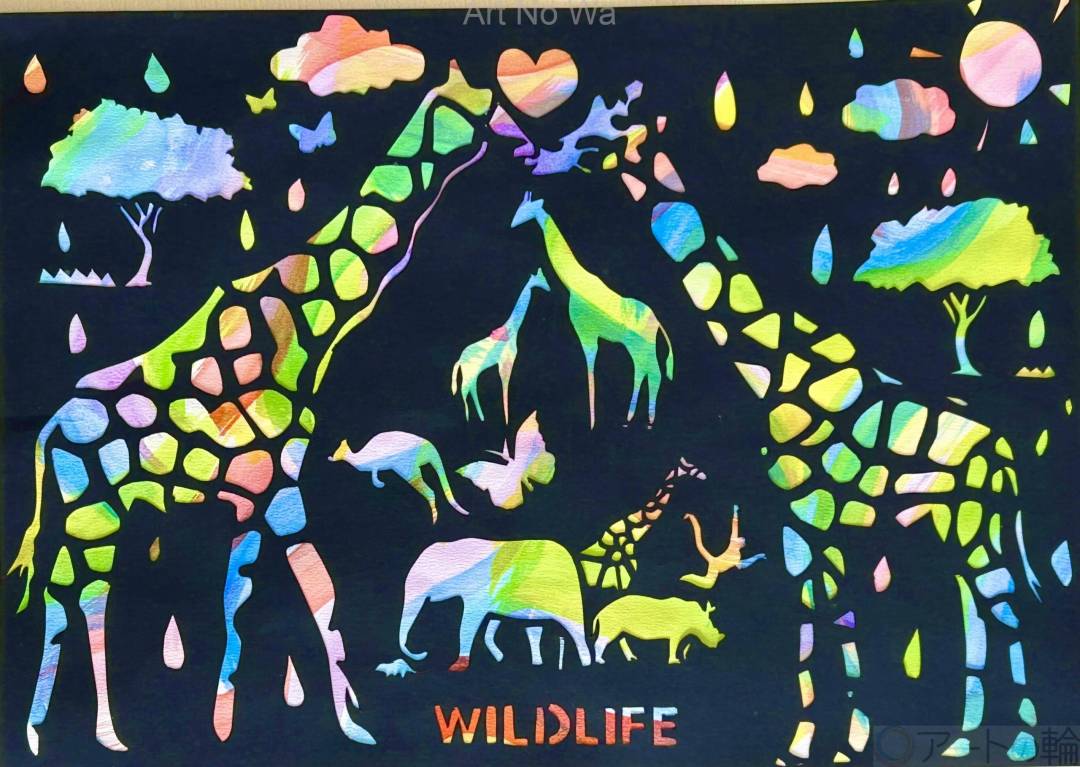 麒麟は他者を慈しみ思いやりを持った優しい動物で奉平の印になっています。サイは成功と幸運を象徴し、猿は災難が去って幸せを招く意味があり、蝶々は長寿、再生、復活を象徴しています。この作品の意味は、災難が去って成功と幸運を掴み、再生と復活をし動物達と自然が愛を育みながら、奉平の世を長く生きていくという意味を込めて切り絵で表現しました。