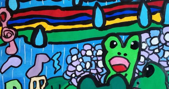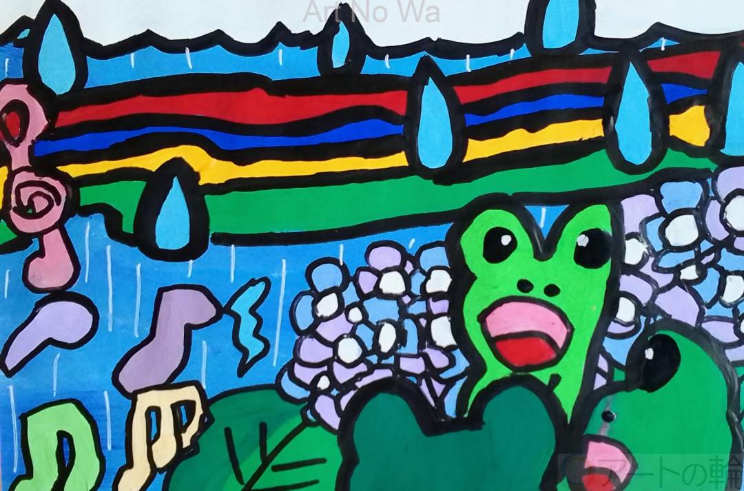 梅雨の雨の中、紫陽花の葉の上でカエル達が歌って合唱している様子を描いてみました。