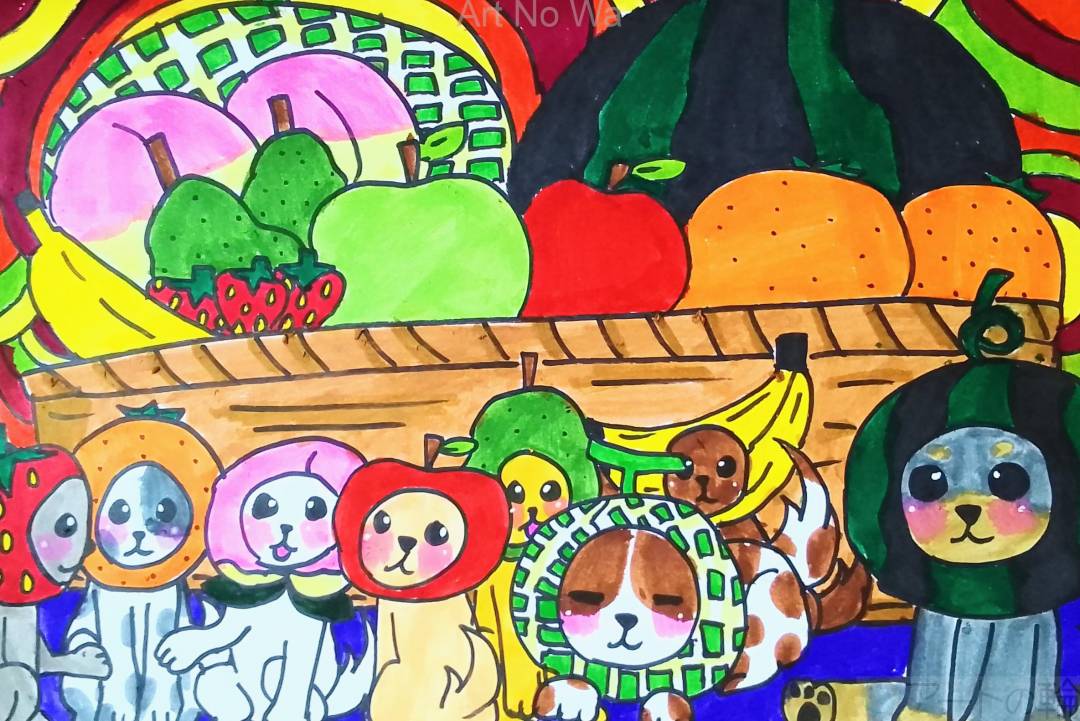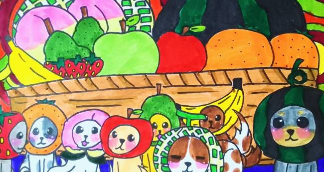 それぞれの果物になりきっている犬を可愛く描いてみました。