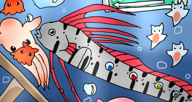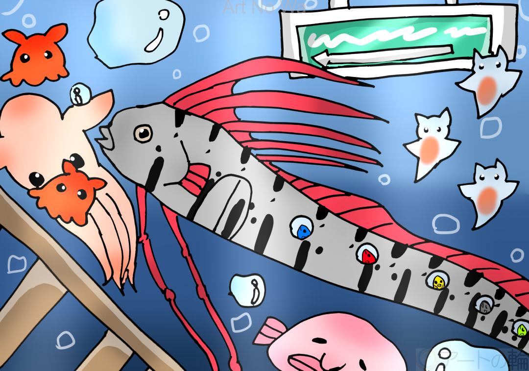 深海に行けることを想像して、深海魚のリュウグウノツカイを乗り物にして描いてみました。他の深海魚も歓迎するかのように楽しく泳いでいます。