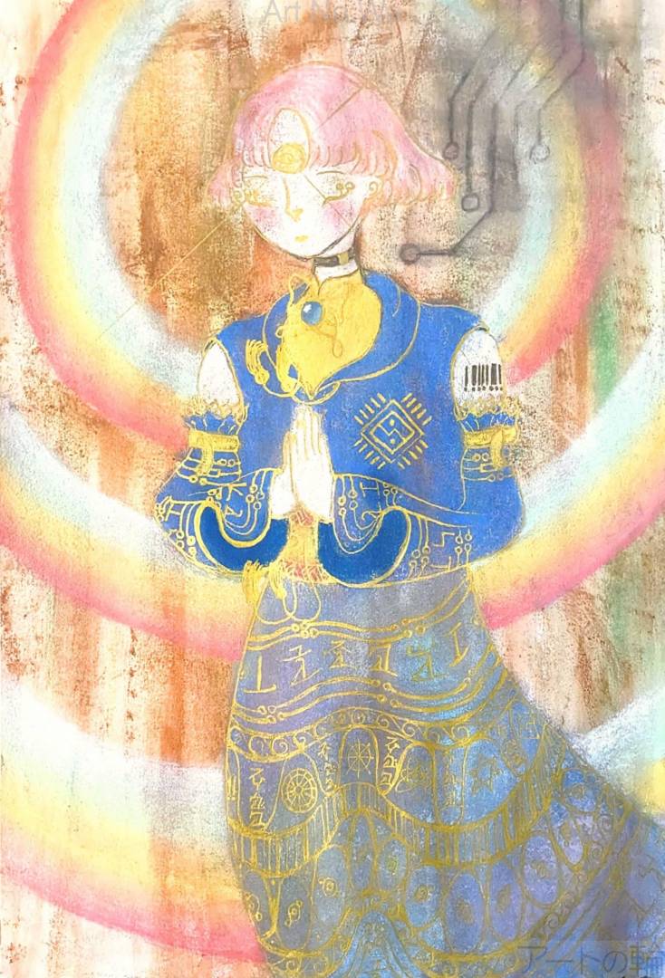 「祈っても何も変わんねぇよ」と現代人に言われがちな「祈り」という行為。パーカーを着た女人はそれでも、ただ祈る 。 服の柄から察するに、発達した技術と共に生きている人間と思われる。 実は祈る行為には、根拠が3つ在る。事前に入ってきた情報により、その後の行動が促進されるという効果。言霊がこれと同じ理論。矛盾した認知を不快と感じること。目標を設定すると、それに満たない自分との差を感じる。それは努力の動力源にもなる。かつてカリフォルニア大学にて、心臓病の患者393名を2つのグループに分け、その片方を他の人々から回復を祈ってもらうという実験を行った。結果的に病状悪化した者が、何もされなかったグループが48名、祈りを受けたグループのうちわずか9名だった。祈りとは、躊躇を払い行動する力を取り戻す”呪術”なのだ。