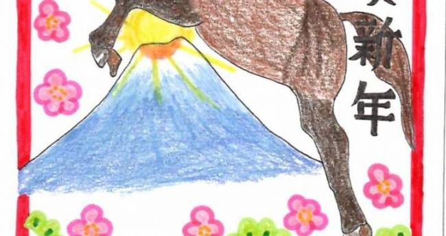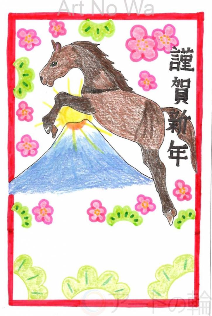 来年は富士山のような高い壁でも乗り越えていけるようにという想いを込めて描きました。自分自身を馬に例えて馬が富士山の上を越えているように描きました。来年も成長ある年にしていきたいです。