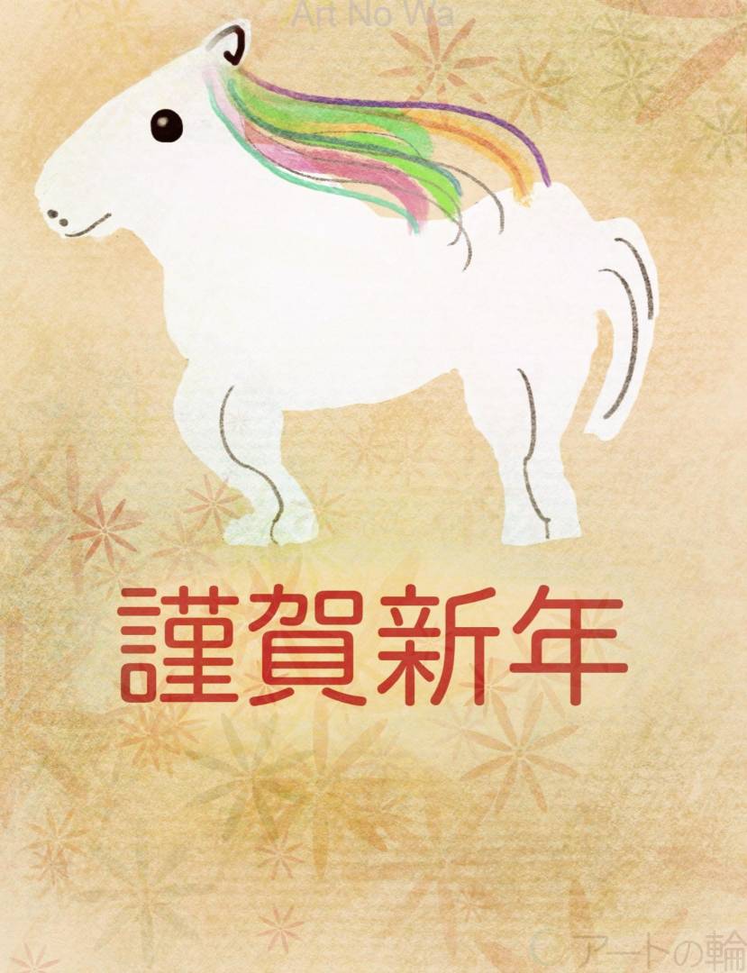 午年の年賀状です。カラフルなたてがみの馬を描きました。