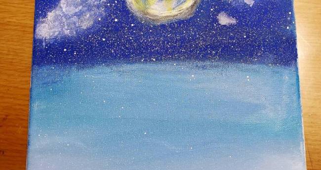 僕の故郷、沖縄の綺麗な海とキラキラな星空を描きました!星は歯ブラシを使って細かく絵の具を飛ばしキラキラを表現しました!
