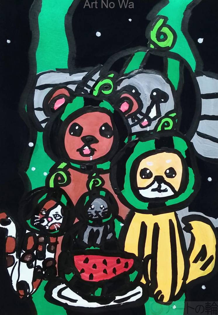 よだれを垂らしながらスイカを美味しそうに見つめている動物達を描いてみました。