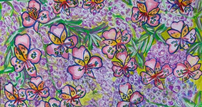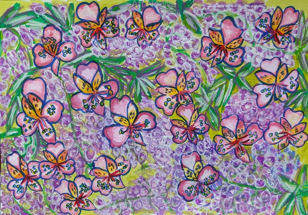小学3年生の頃学校の先生が読書感想画のコンクールをすすめて参加したら入賞したきっかけで母のすすめもあり絵を描くのが好きになりました。特に花が好きで紙に大好きな花…