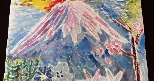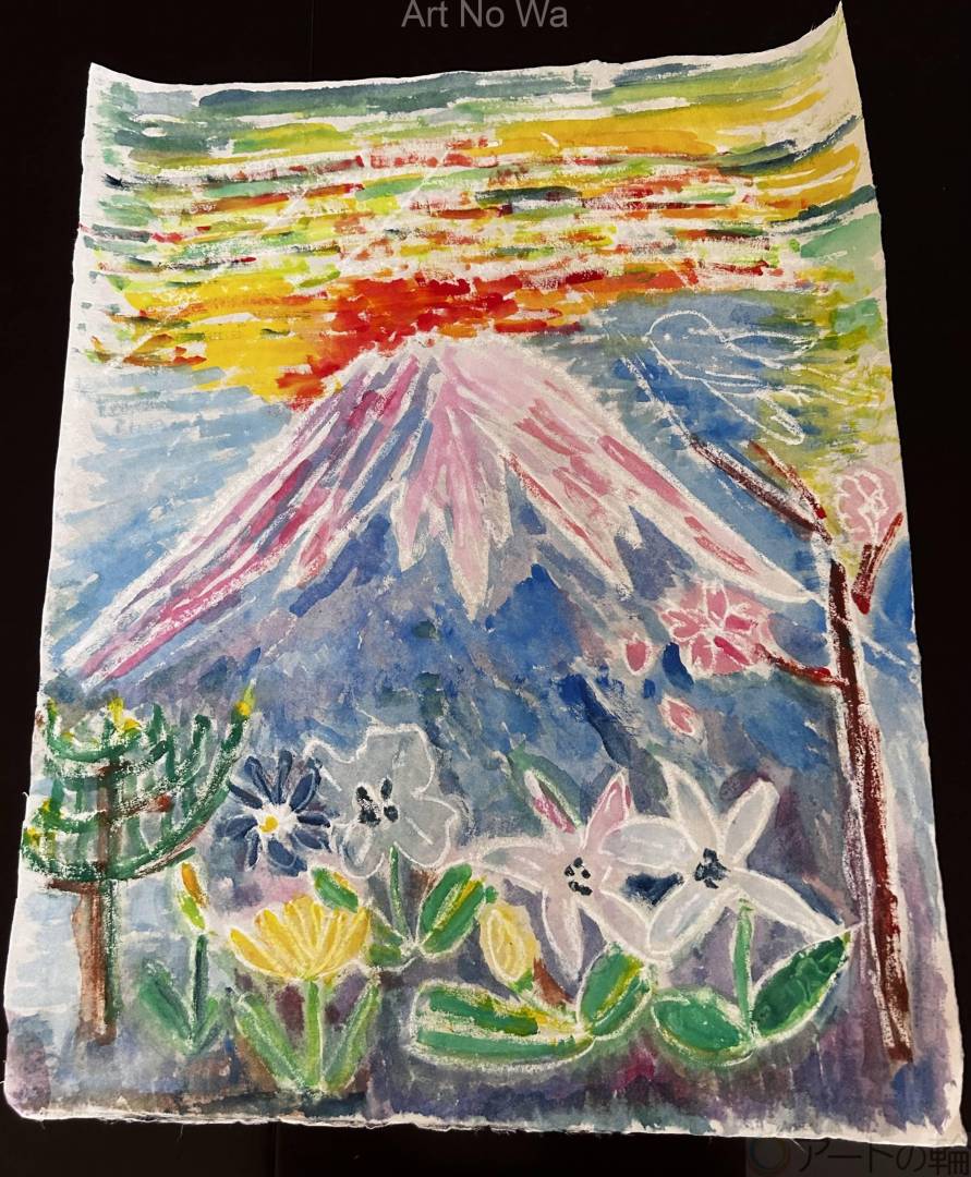 毎日犬とおさんぽの時、富士山が見えます。寒い日あつい日いろんな色の空と富士山です。この絵は、まだ朝になる少し前のきれいな色を描きました。いつも心にいっしょにいる希望の鳥も飛んでいます。夜に咲くお花たちも描きました。