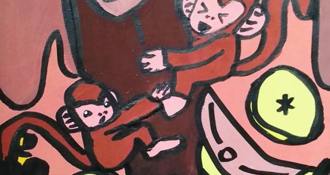 チョコがかかっているバナナの家に猿がしがみ付いて楽しそうにしている様子を描いてみました。