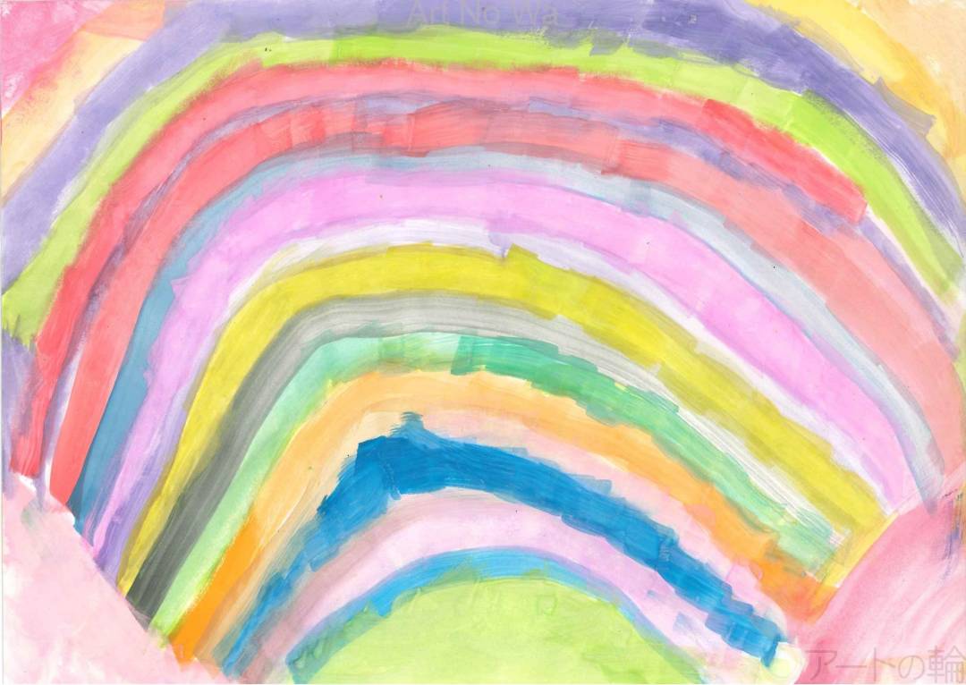 画面いっぱいに広がる柔らかな曲線は、まるで心の中に差し込む光のよう。絵具の重なりがつくり出す滲みや揺らぎには、描き手の素直な感情と、色に対する純粋な喜びがあふれています。 虹というモチーフは「希望」や「つながり」の象徴として親しまれていますが、この作品における虹は、きれいに整列したものではなく、一つひとつの色が個性をもって自由に弧を描いています。まるで「みんなちがって、みんないい」と語りかけるような、寛容さとやさしさに満ちた世界です。 色彩の選び方にも注目です。ピンクや黄緑、水色など、心をふんわりと包むようなトーンが重ねられ、それぞれの色が主張しすぎることなく、共鳴し合うように存在しています。この絶妙なバランス感覚は、計算ではなく、描き手の感性そのもの。眺める人の心にも、そっと寄り添ってくれる一枚です。