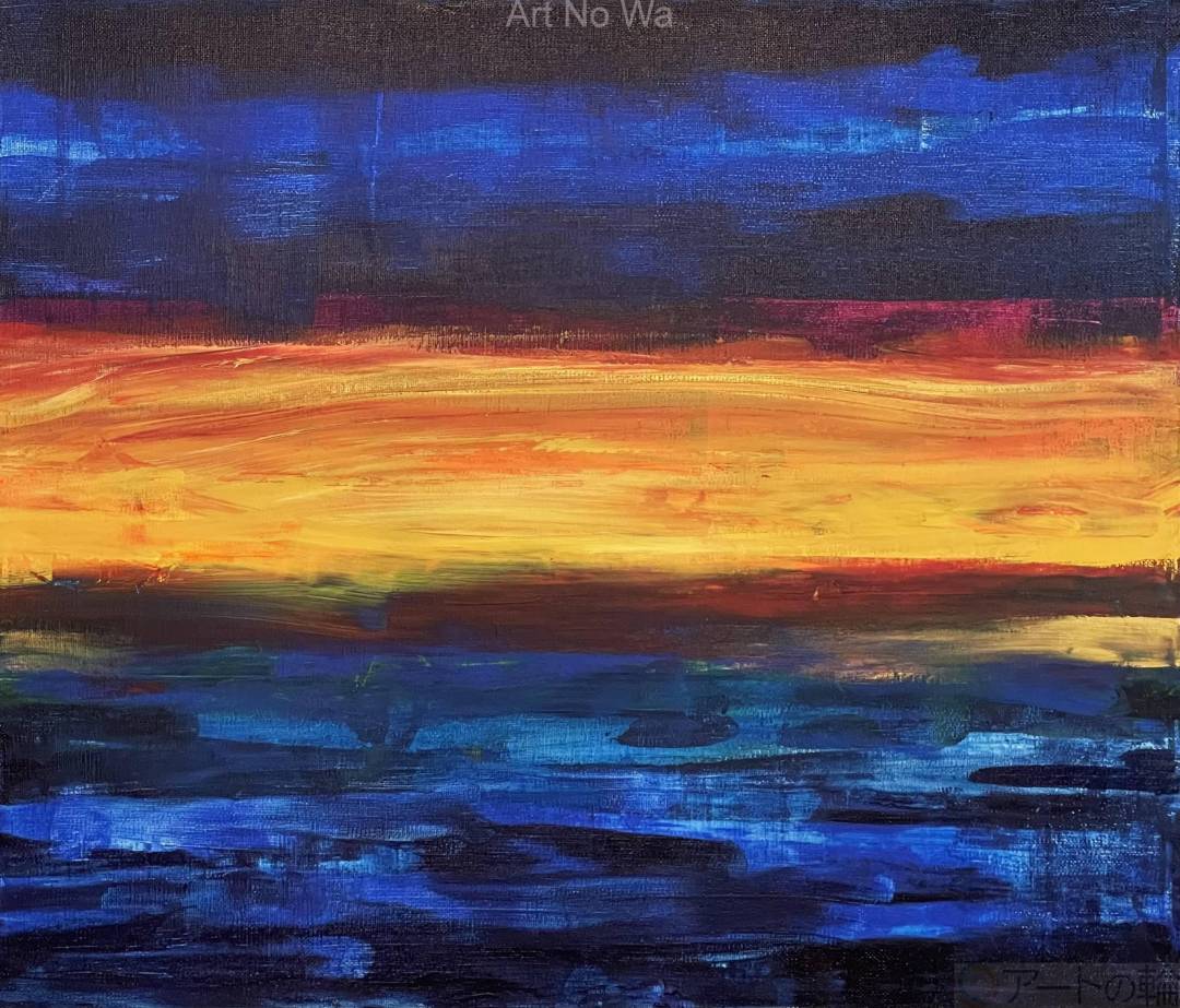 誠実さの印象を持つ青の中に一本の火柱のような情熱的で真ん中を貫くまっすぐな「信念」を、大きなキャンバス上で表現しました。グラデーションのような効果も出るように意識しました。