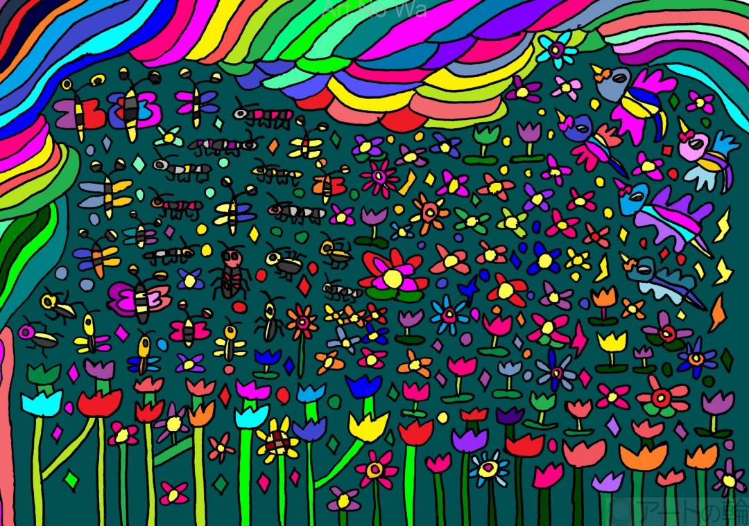 未来の花は昼間太陽の光を浴びて夜でもきれいに光るのです。 その光は空や鳥まできれいに輝かせます。
