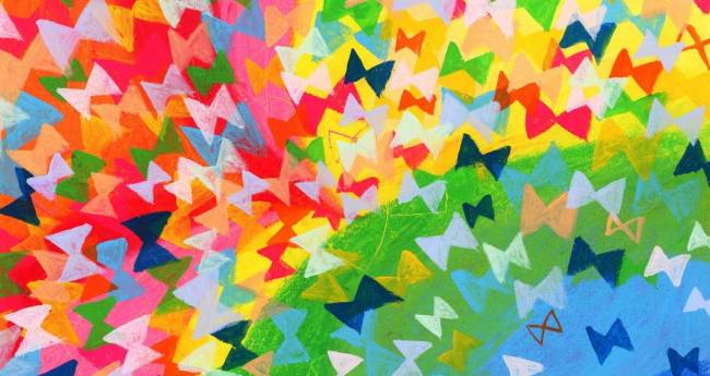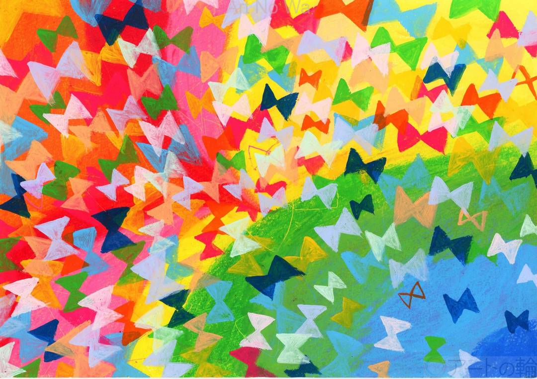 「無限の可能性」と聞いて、モチーフが爆発的に増えるイメージが湧きました。自分の考えややりたいことを表現するのが苦手で、何かを自分の内から外へ出すことに抵抗があります。心の中にずっとしまっていた自分自身を少しでも外に出せたら一気に世界が広がって、限りない可能性が私の内側からほとばしるのではないか、人は変わることができる、そんな想像を抽象的に描きました。