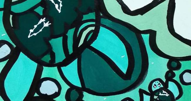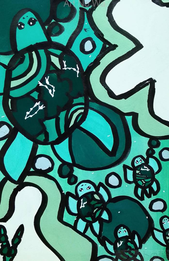 不思議に海の中に咲いているハイビスカスの所を親子ガメが散歩している様子を描いてみました。