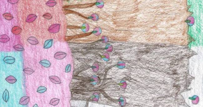 冬になっても葉っぱが枯れない、木の実がなる木です。青色や紫色の葉っぱがあればいいなと思って描きました。校長は枝を使って、木の実をとろうとしています。キャサリンは地面に落ちた木の実を食べています。