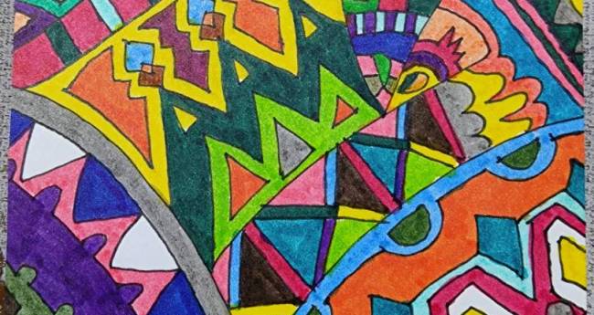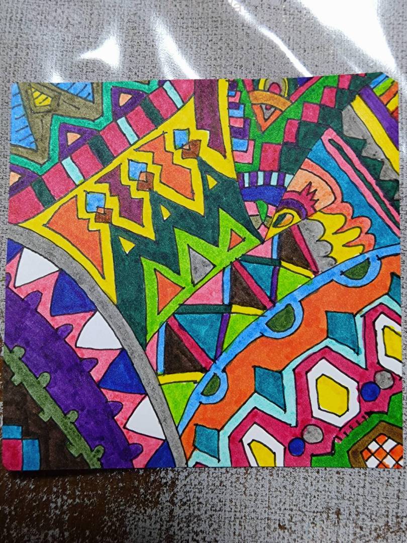 線画の後、カラーマスター25色で塗る。気分がのっている時は見た目鮮やかな絵が仕上がる。このような絵を今は『抽象デザイン』と呼んでいる(自分の中で)。