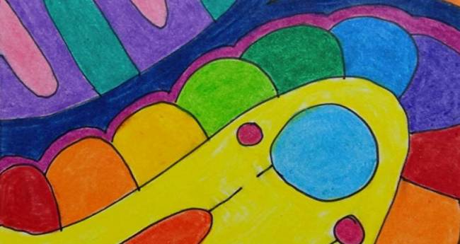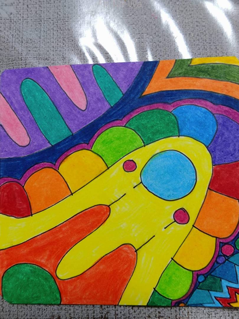 カリスマカラー20色で塗る。筆圧強めな自分なので、カリスマカラーはとても塗りやすく、好きな画材の1つ。黄色が発色よく、ロケットにも見えたが、1つ1つの色が模様と合わさり、上手く主張してるように見えたので、このタイトルに。