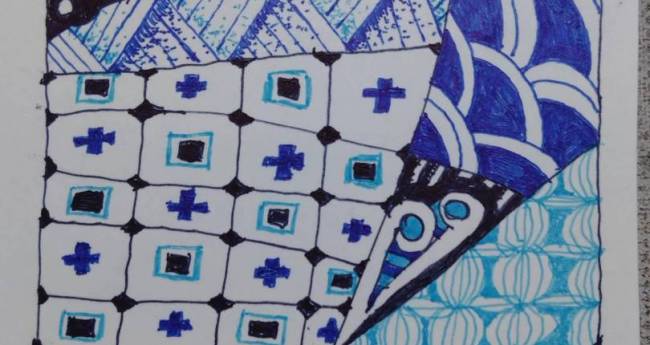 紺・青・水色でゼンタングルを描く。三角の点描がある所は海のしぶき、扇形の所は波など、様々な模様が海を感じさせる。3色だけで塗れたことも良かったと思う。
