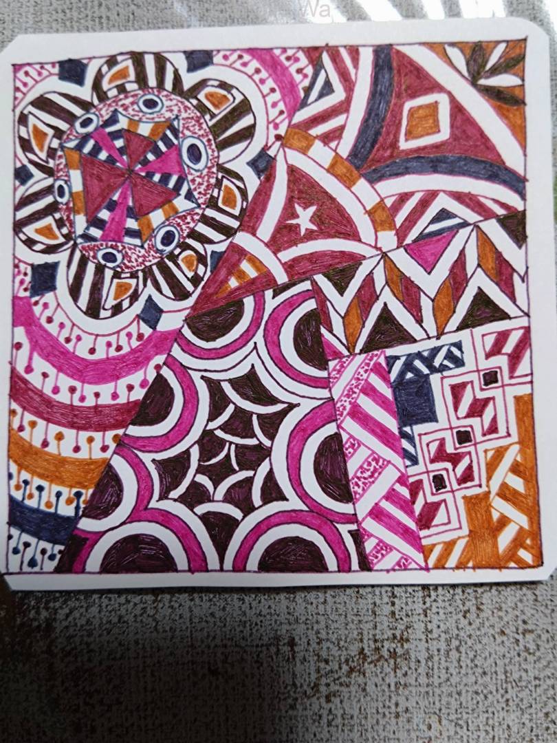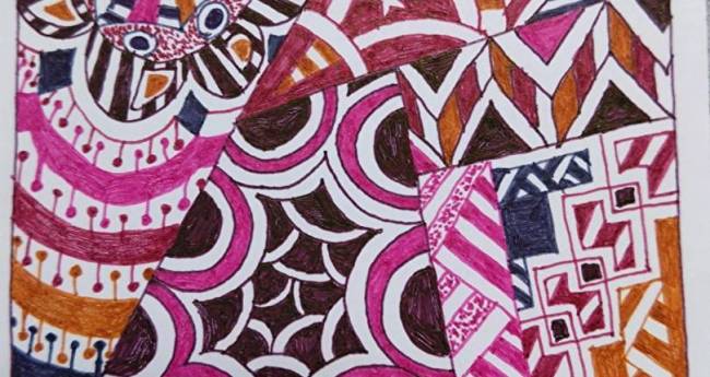心のときめき、胸がドキドキする様子を描いた。濃いピンク、濃い赤、濃い紫、黄土色で色の重なりを風船が膨らんだりしぼんだりするイメージで表した。