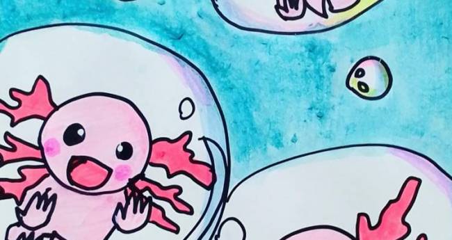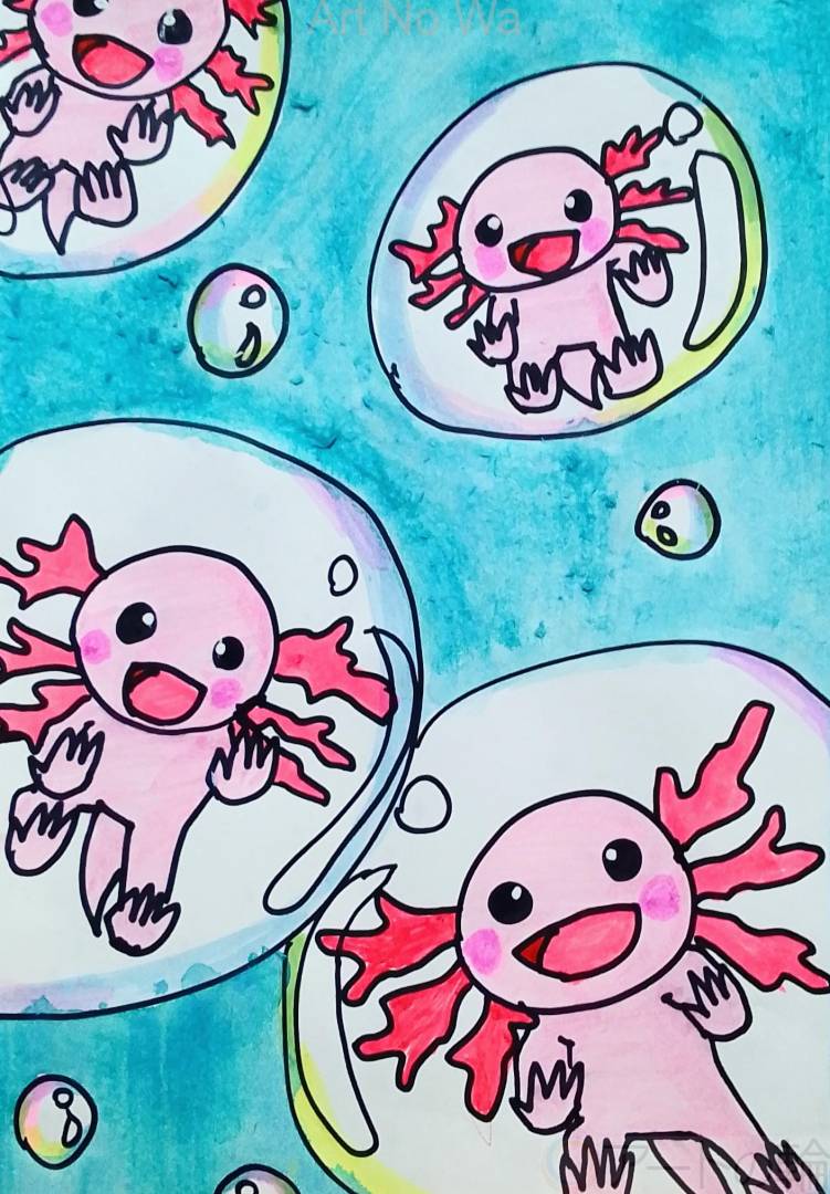 シャボン玉に吹かれて中に入って飛んでいるウーパールーパーを描いてみました。
