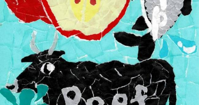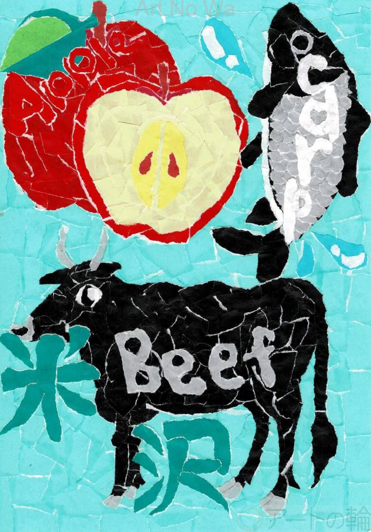 米沢のA(Apple)B(Beef)C(Carp)を折り紙を用いたちぎり絵で作りました