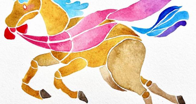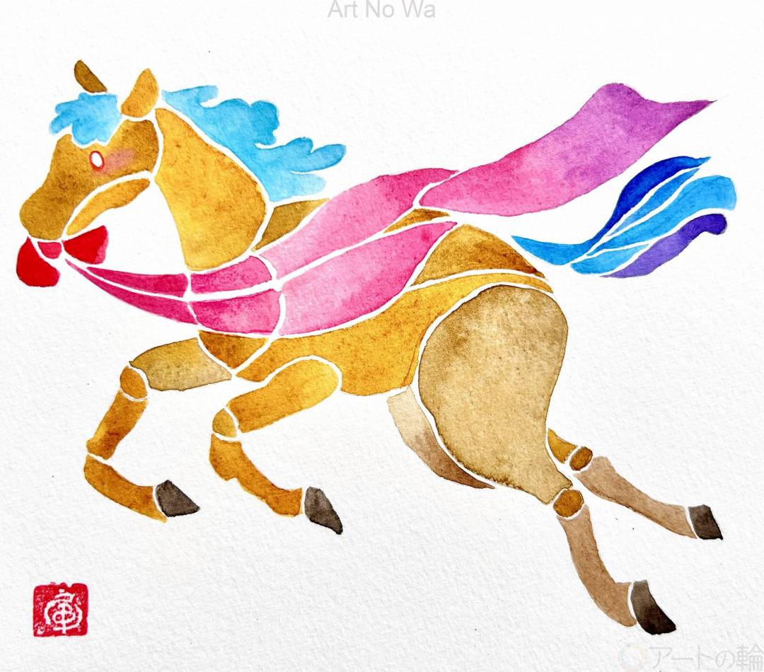 天馬翔け、新たな一年を寿ぐ。 画材 ウォーターフォード水彩紙、W&N透明水彩、マイメリ透明水彩