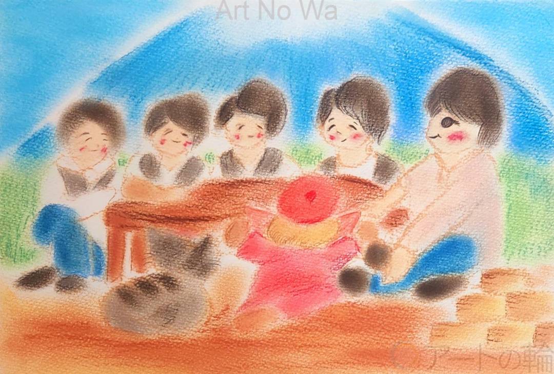 ふじさんのまえでにほんのしあわせについてかたるひとびと
