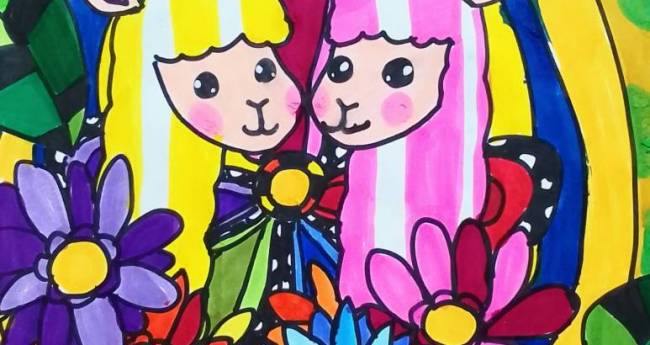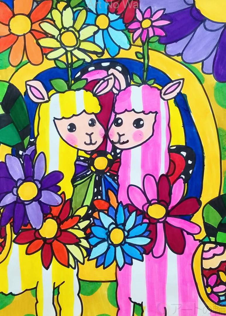 頭の上に花が咲いている2匹のアルパカを描いてみました。